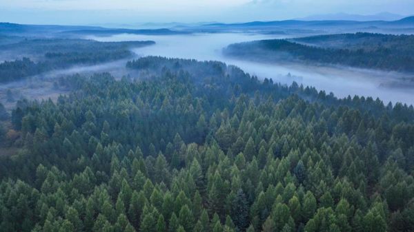 青雾缭绕的塞罕坝(无人机照片,2023年9月9日摄)。新华社发(刘满仓摄)